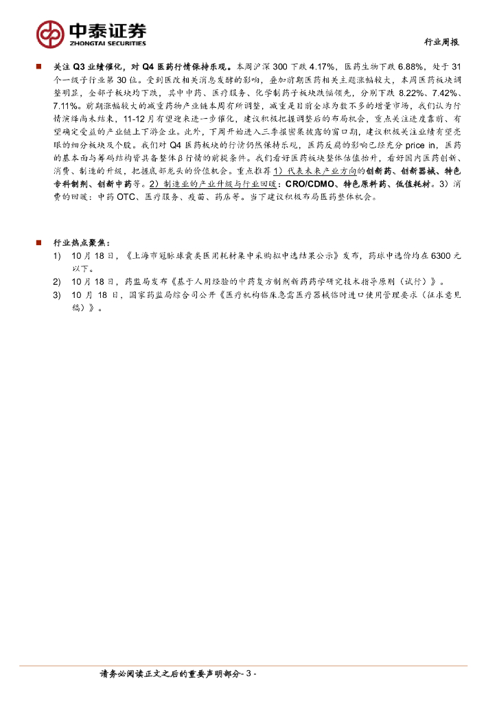 中泰证券:医药生物行业周报:关注Q3业绩催化,对Q4医药行情保持乐观.pdf