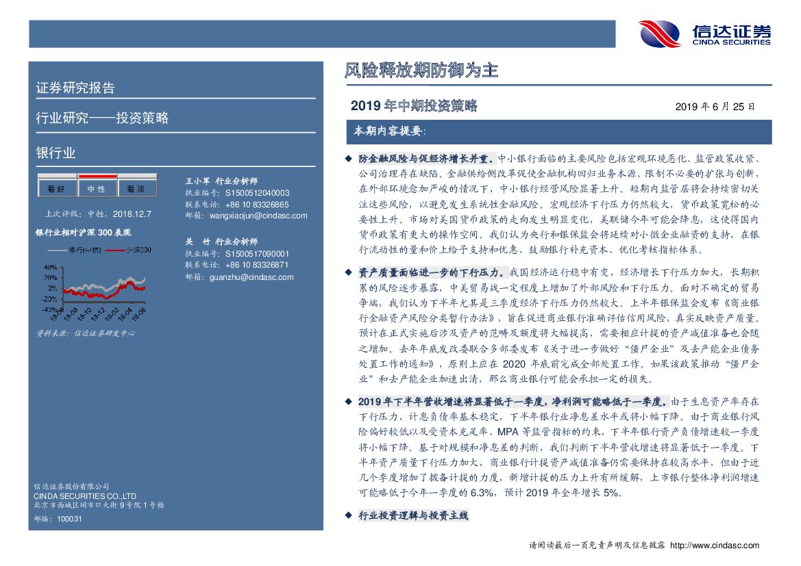 信达证券:银行业2019年中期投资策略:风险释放期防御为主.pdf