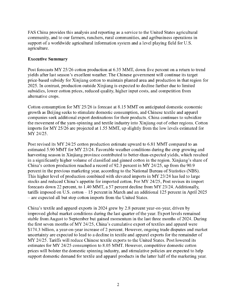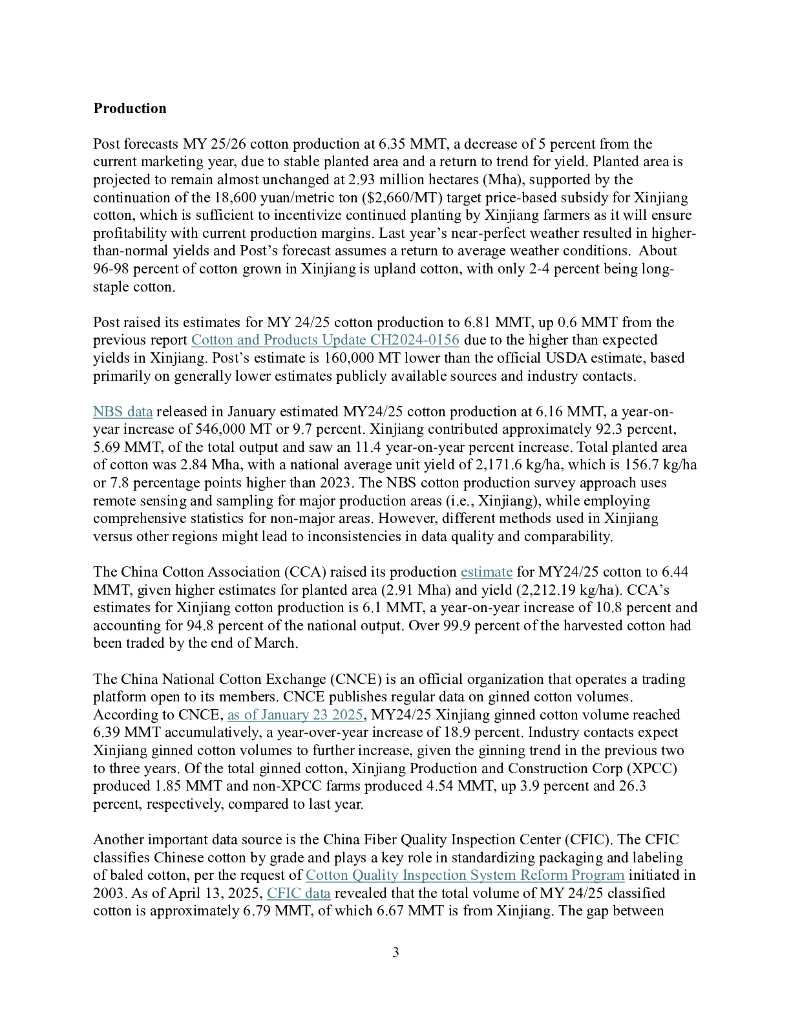 美国农业部(USDA):2025年中国棉花及其制品市场年度报告(英文版).pdf