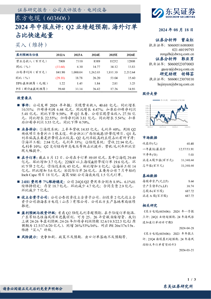 东吴证券:东方电缆(603606)-2024年中报点评:Q2业绩超预期,海外订单占比快速起量.pdf