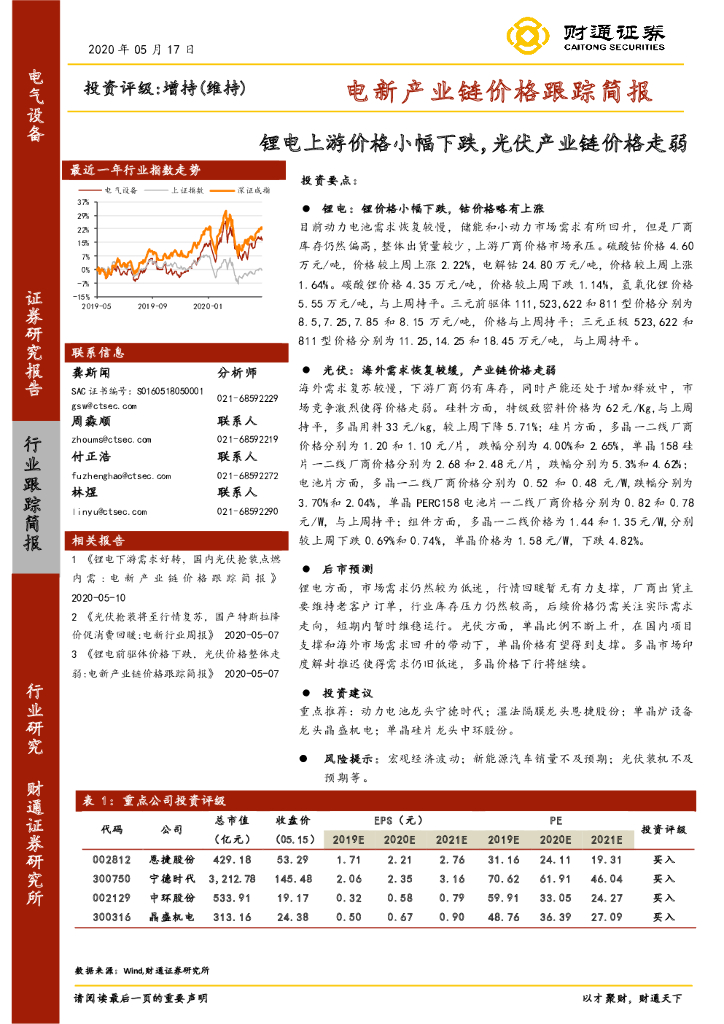 财通证券:电新产业链价格跟踪简报:锂电上游价格小幅下跌,光伏产业链价格走弱.pdf