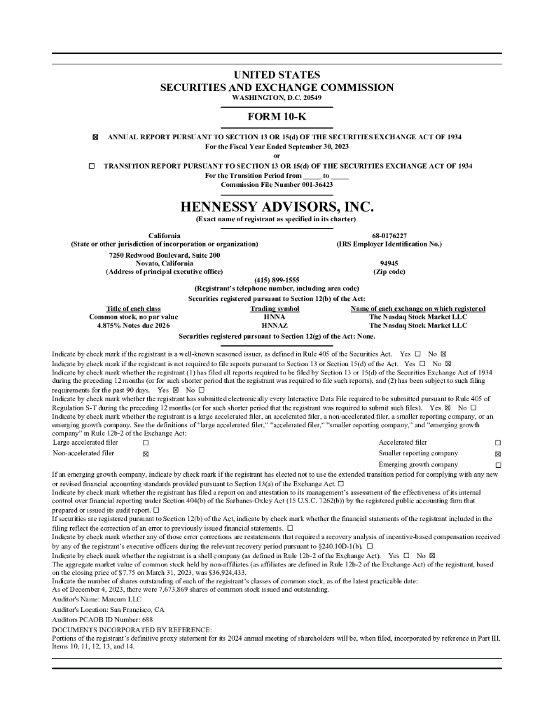 Hennessy Advisors, Inc.(HNNA)2023财年年度报告(英文版).pdf