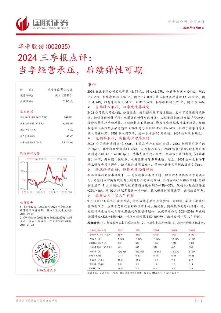 国联证券:华帝股份(002035)-2024三季报点评:当季经营承压,后续弹性可期.pdf