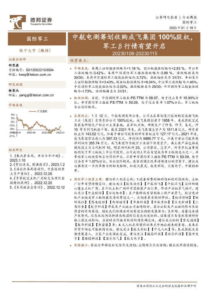 德邦证券:国防军工行业周报:中航电测筹划收购成飞集团100%股权,军工β行情有望开启.pdf