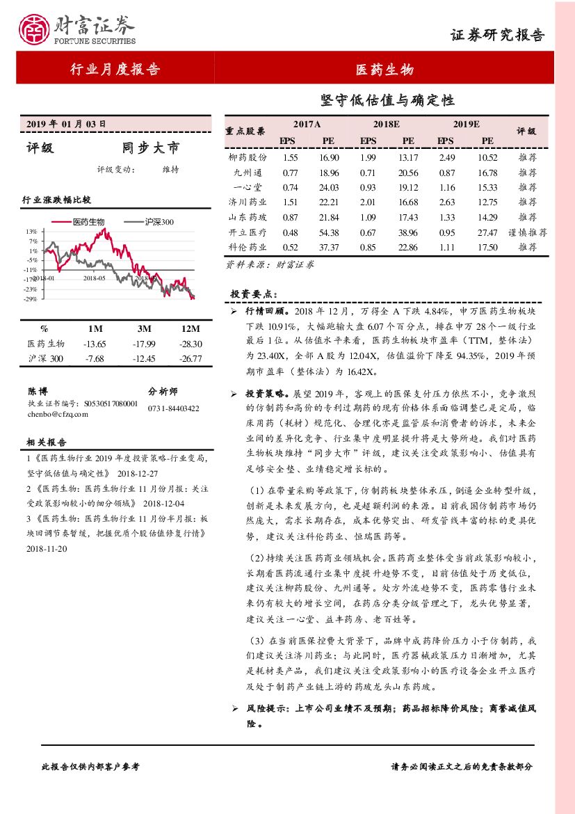 财富证券:医药生物行业月度报告:坚守低估值与确定性.pdf