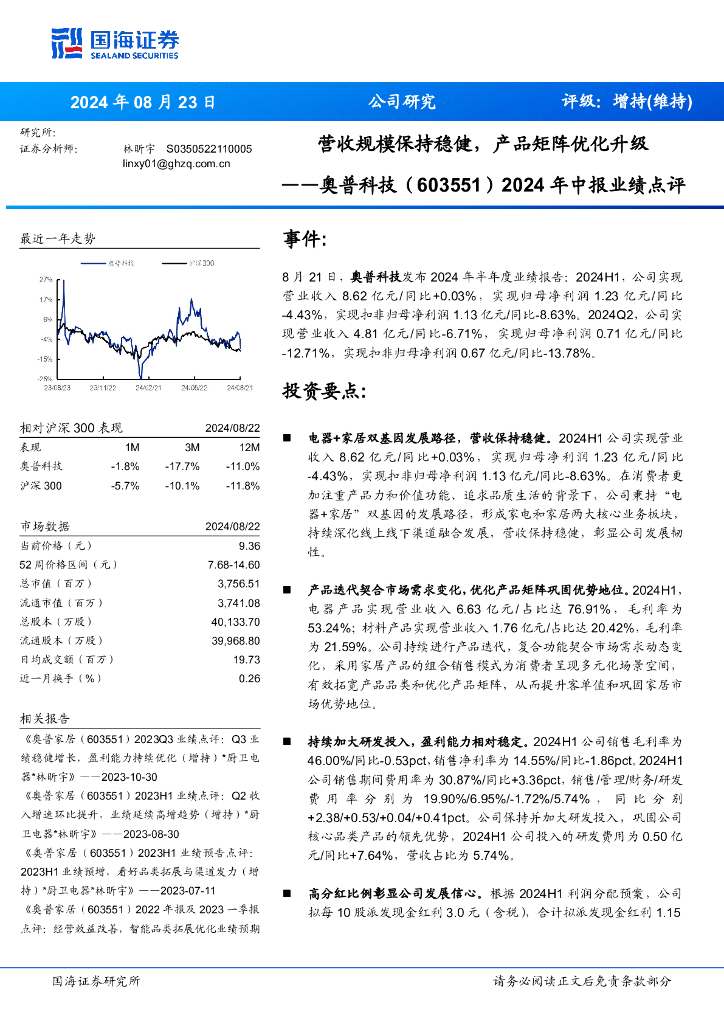 国海证券:奥普科技(603551)-2024年中报业绩点评:营收规模保持稳健,产品矩阵优化升级.pdf