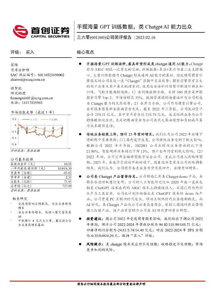 首创证券:三六零(601360)-公司简评报告:手握海量GPT训练数据,类Chatgpt AI能力出众.pdf