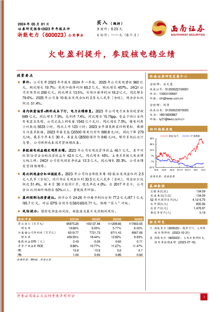 西南证券:浙能电力(600023)-2023年年报点评:火电盈利提升,参股核电稳业绩.pdf
