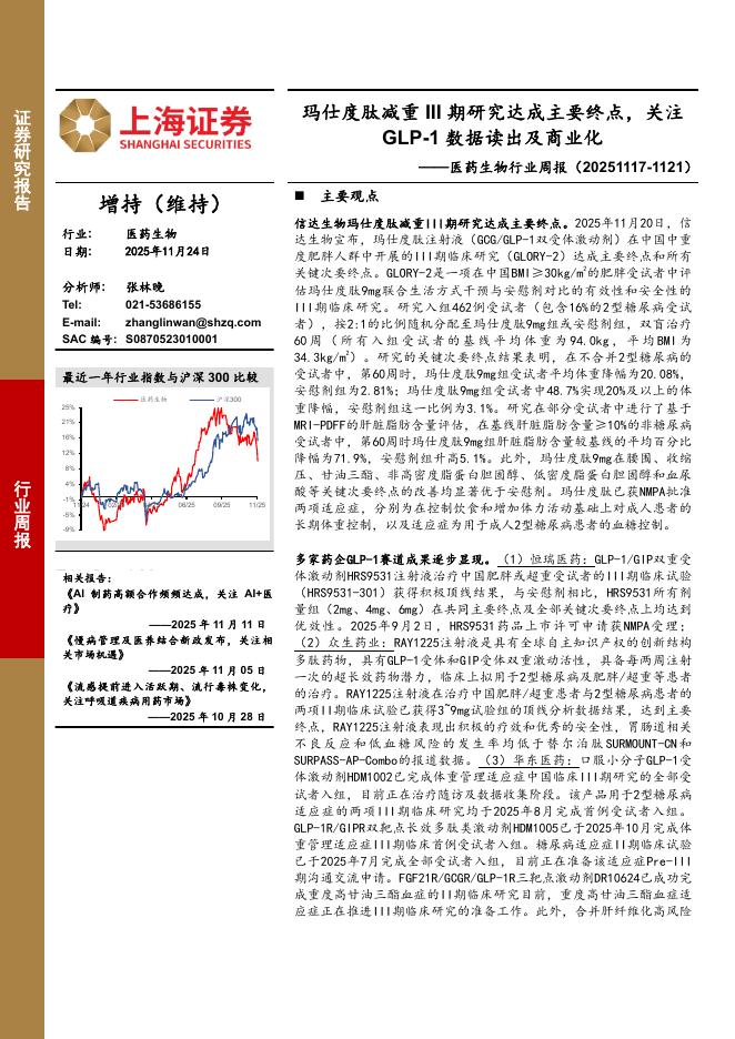 上海证券:医药生物行业周报:玛仕度肽减重III期研究达成主要终点,关注GLP-1数据读出及商业化.pdf
