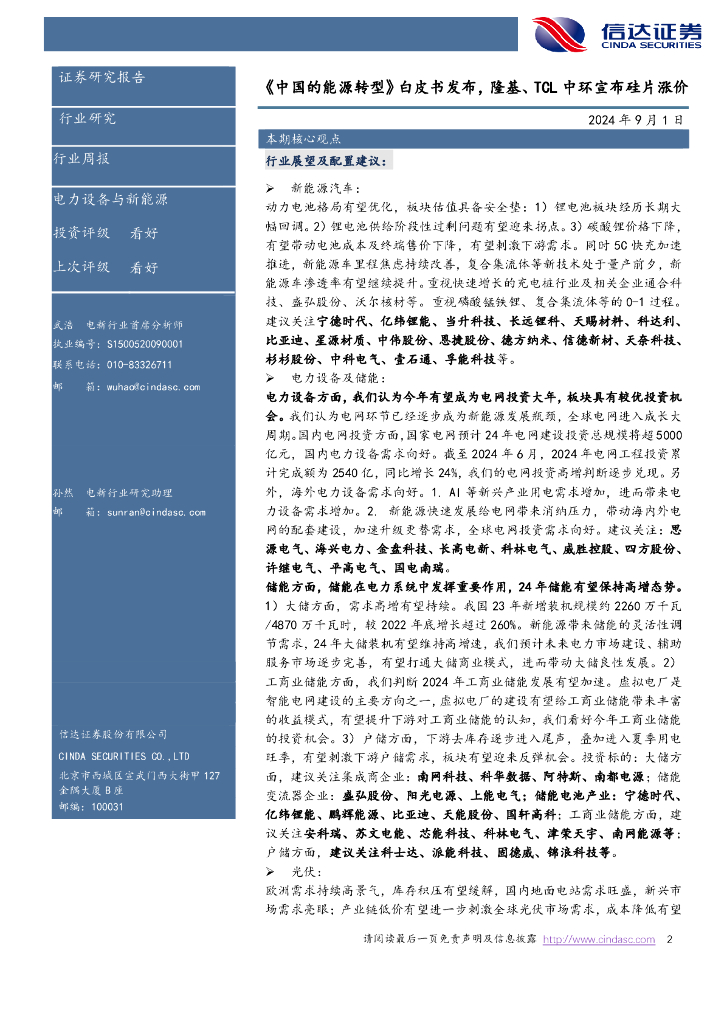 信达证券:电新周报:《中国的能源转型》白皮书发布,隆基、TCL中环宣布硅片涨价电力设备与新能源.pdf