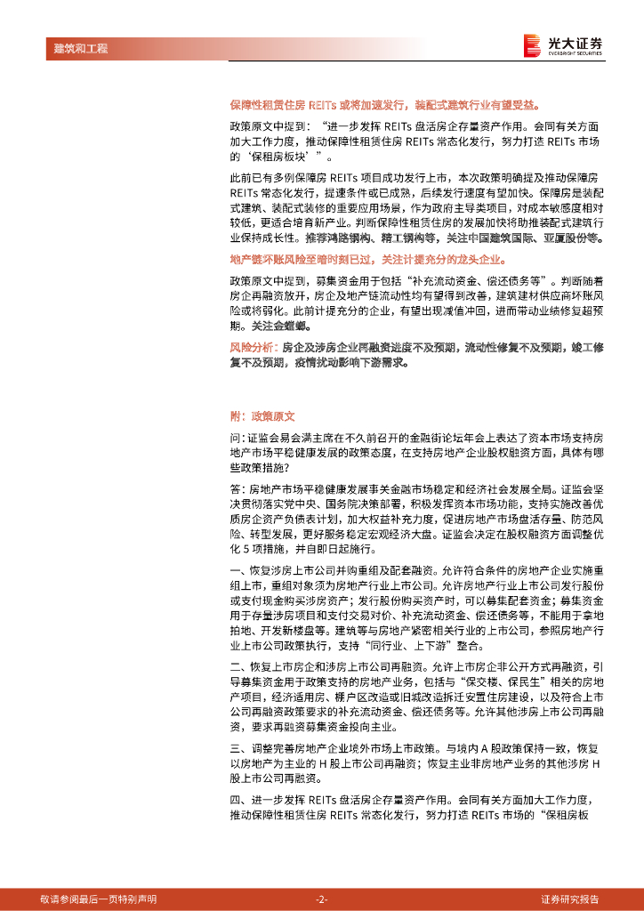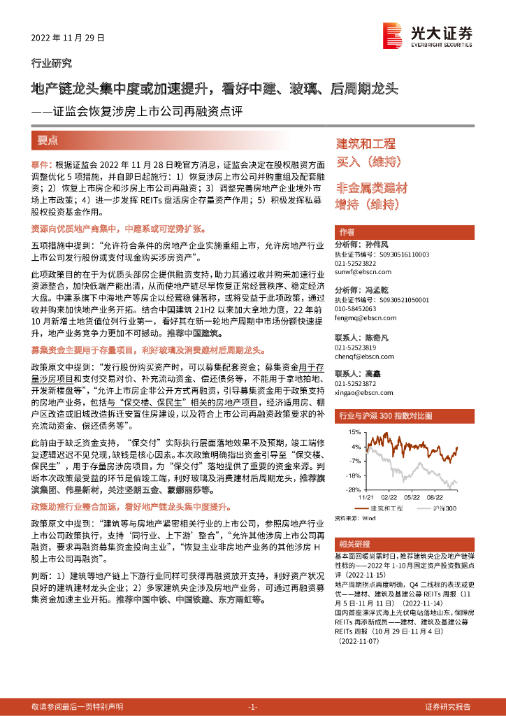 光大证券:建筑和工程行业研究:证监会恢复涉房上市公司再融资点评-地产链龙头集中度或加速提升,看好中建、玻璃、后周期龙头.pdf