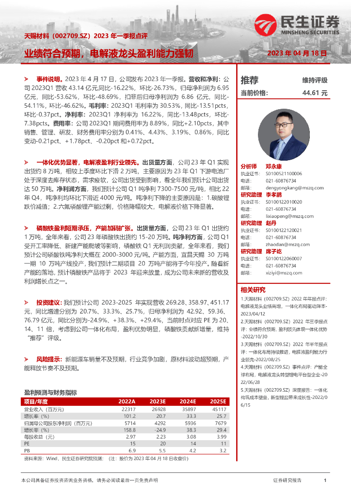 民生证券:天赐材料(002709)-2023年一季报点评:业绩符合预期,电解液龙头盈利能力强韧.pdf