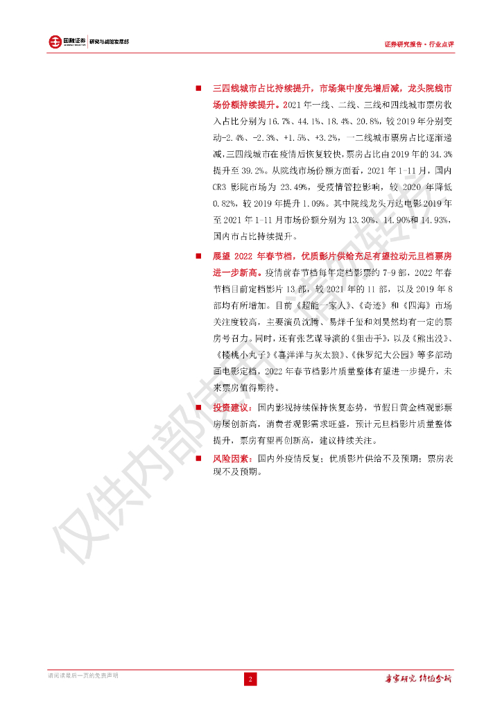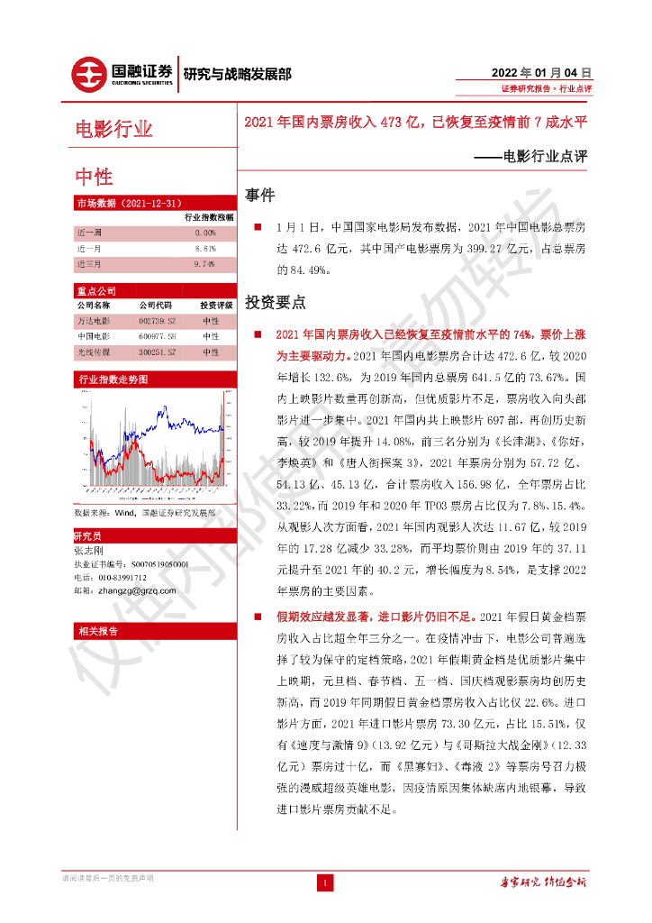 国融证券:电影行业点评:2021年国内票房收入473亿,已恢复至疫情前7成水平.pdf