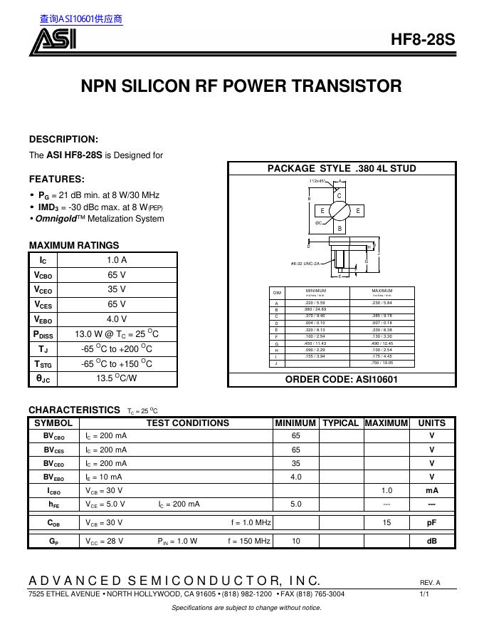 NPN SILICON RF POWER TRANSISTOR HF8-28S 数据手册.pdf