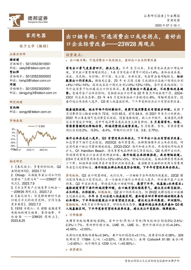 德邦证券:家用电器23W28周观点:出口链专题:可选消费出口或迎拐点,看好出口企业经营改善.pdf
