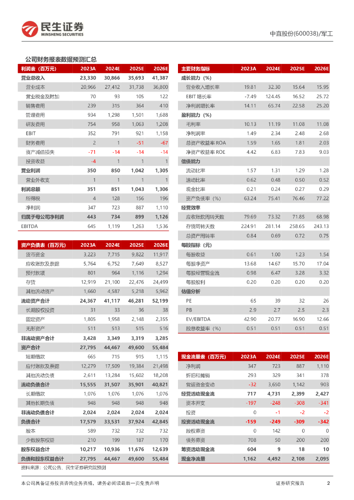 民生证券:中直股份(600038)-2024年半年度业绩预告点评:预计1H24净利润大增超114%;看好直升机龙头长期发展.pdf
