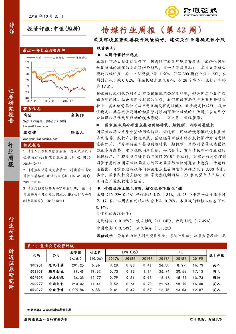 财通证券:传媒行业周报(第43周):政策环境显著改善提升风险偏好,建议关注业绩确定性个股.pdf