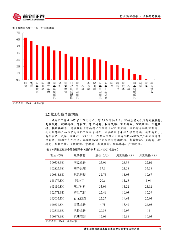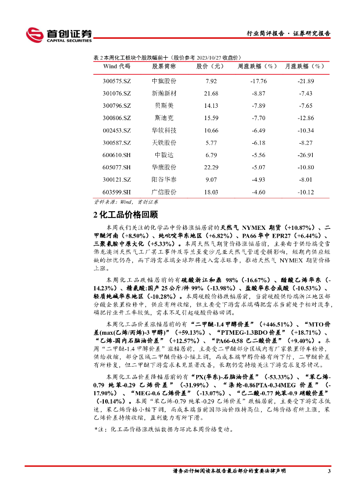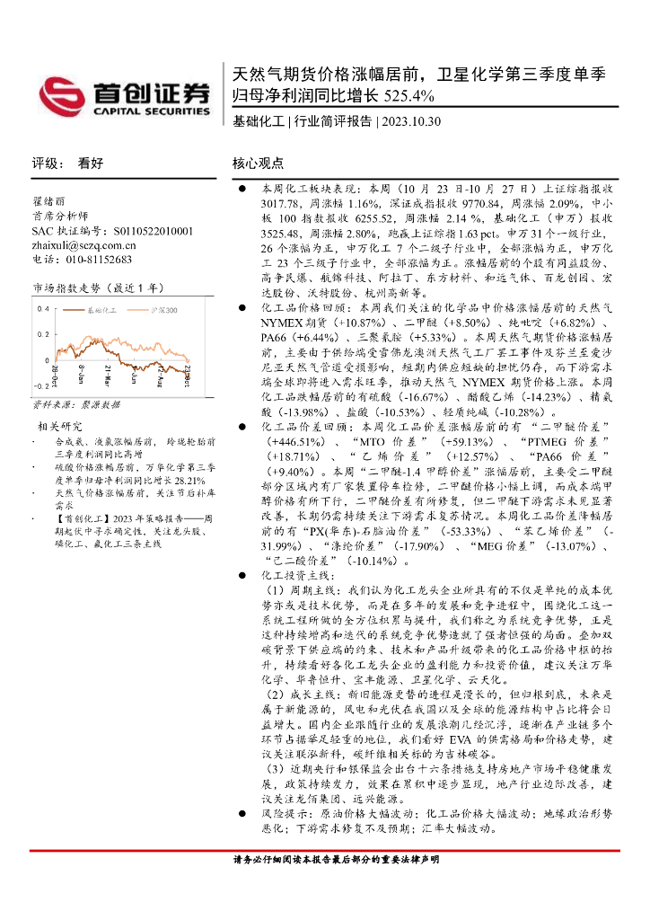首创证券:基础化工行业简评报告:天然气期货价格涨幅居前,卫星化学第三季度单季归母净利润同比增长525.4%.pdf