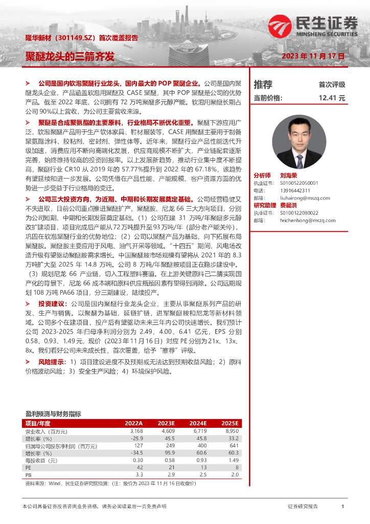 民生证券:隆华新材(301149)-首次覆盖报告:聚醚龙头的三箭齐发.pdf