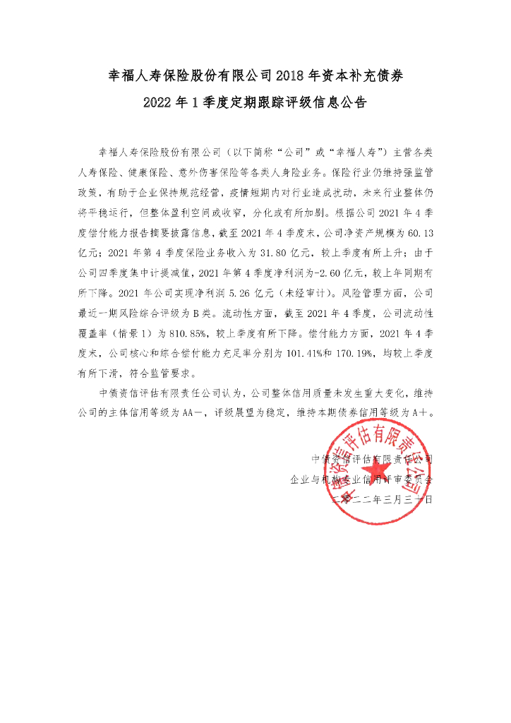 中债资信:幸福人寿保险股份有限公司2018年资本补充债券2022年1季度定期跟踪评级信息公告.pdf