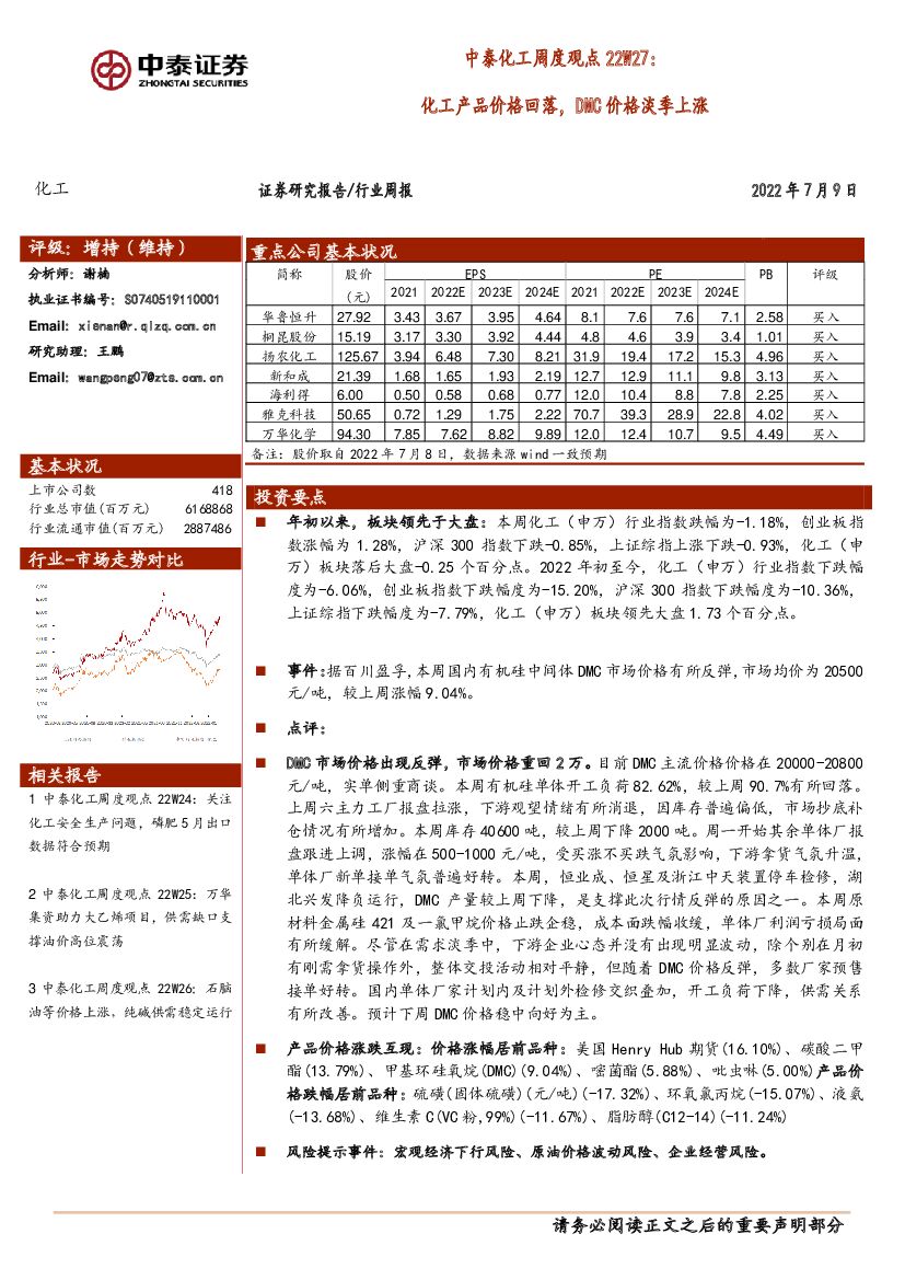 中泰证券:中泰化工周度观点22W27:化工产品价格回落,DMC价格淡季上涨.pdf