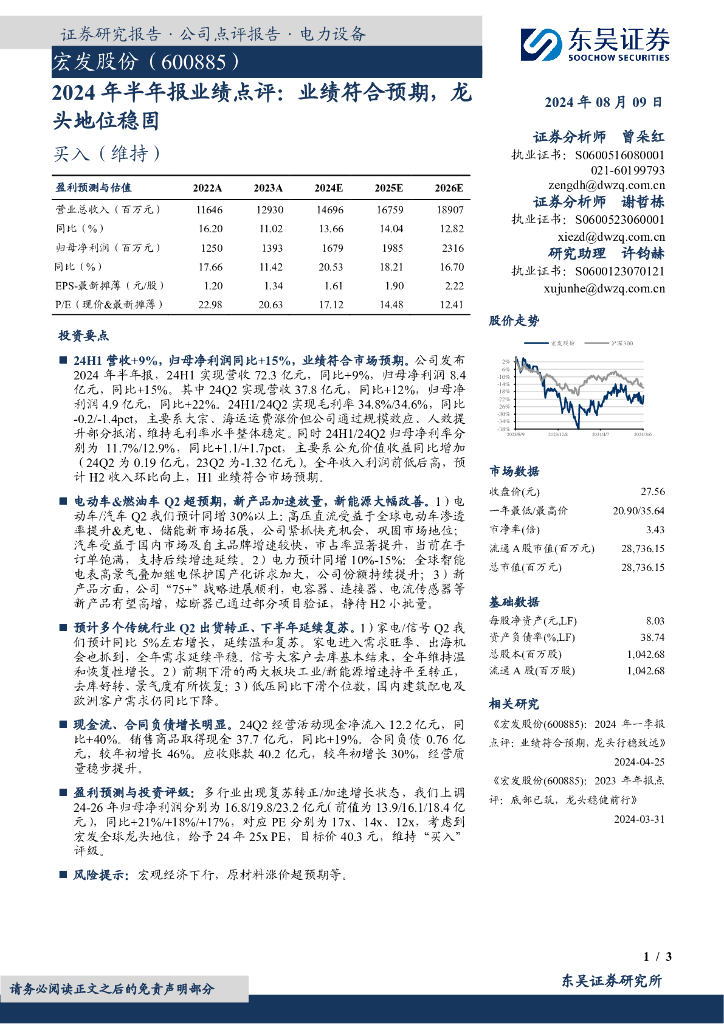 东吴证券:宏发股份(600885)-2024年半年报业绩点评:业绩符合预期,龙头地位稳固.pdf