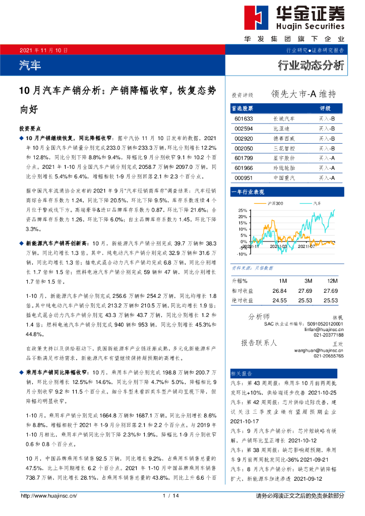 华金证券:汽车行业10月汽车产销分析:产销降幅收窄,恢复态势向好.pdf