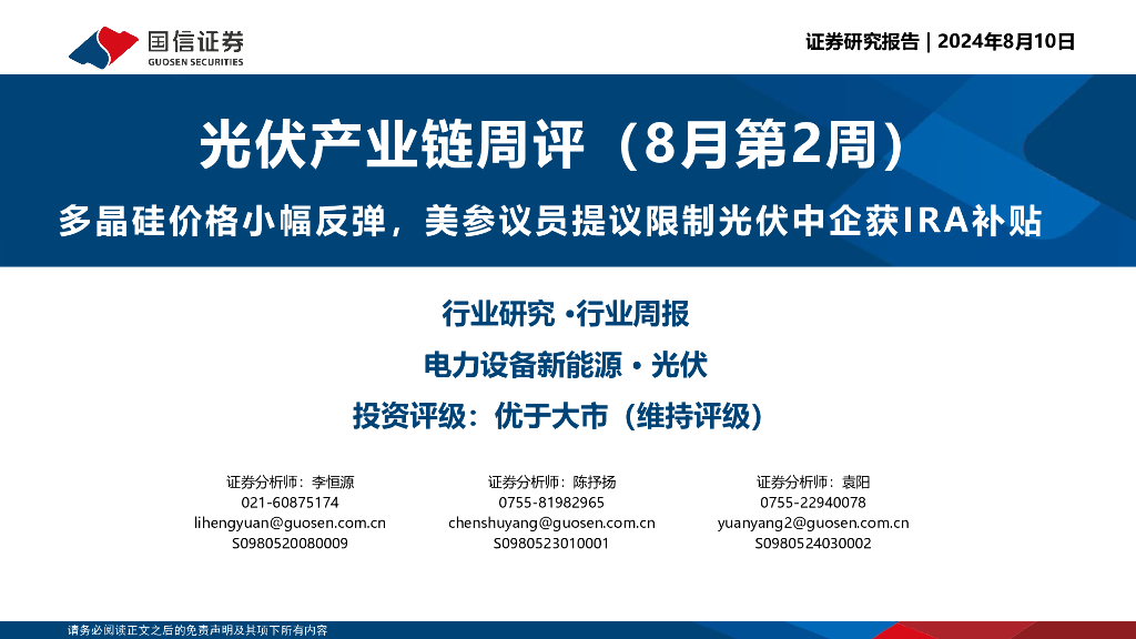 国信证券:光伏产业链周评(8月第2周):多晶硅价格小幅反弹,美参议员提议限制光伏中企获IRA补贴.pdf