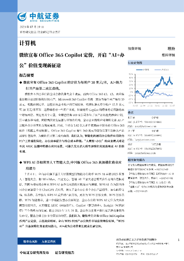 中航证券:计算机:微软宣布Office365Copilot定价,开启“AI+办公”价值变现新征途.pdf