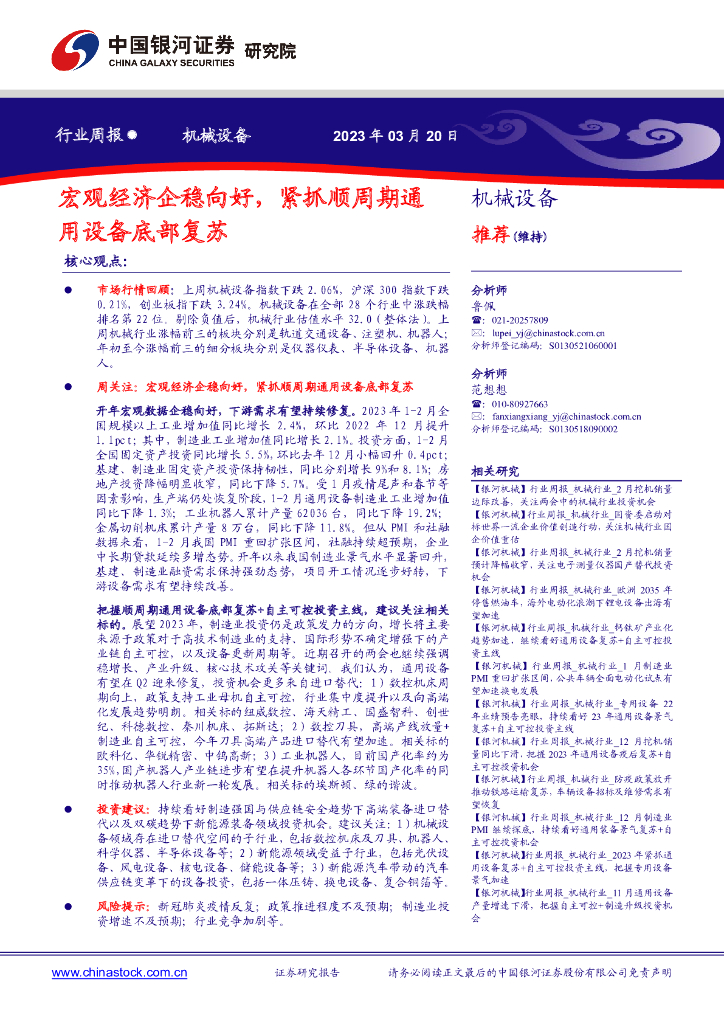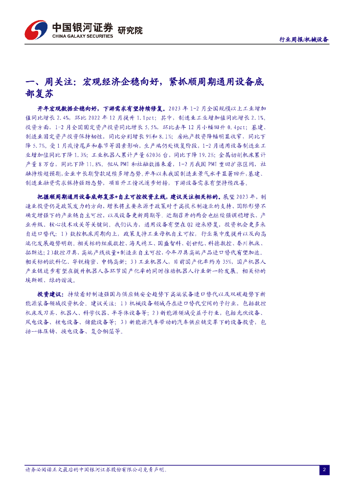 中国银河:机械设备行业周报:宏观经济企稳向好,紧抓顺周期通用设备底部复苏.pdf