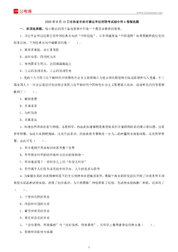 2022年8月13日吉林省吉林市事业单位招聘考试综合岗A卷精选题.pdf