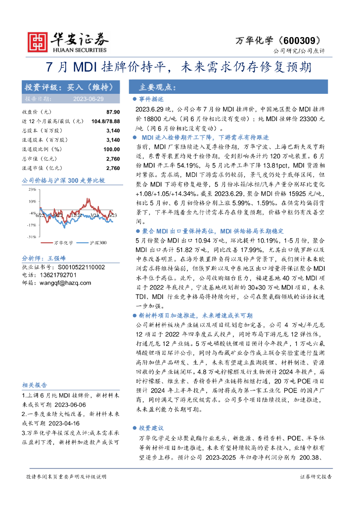 华安证券:万华化学(600309)-7月MDI挂牌价持平,未来需求仍存修复预期.pdf