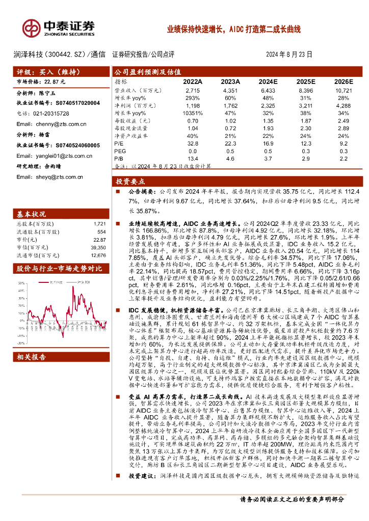中泰证券:润泽科技(300442)-业绩保持快速增长,AIDC打造第二成长曲线.pdf