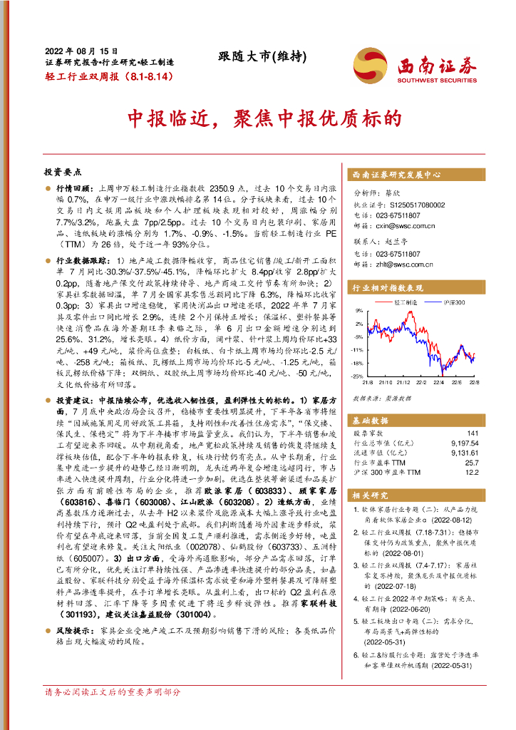 西南证券:轻工行业双周报:中报临近,聚焦中报优质标的.pdf