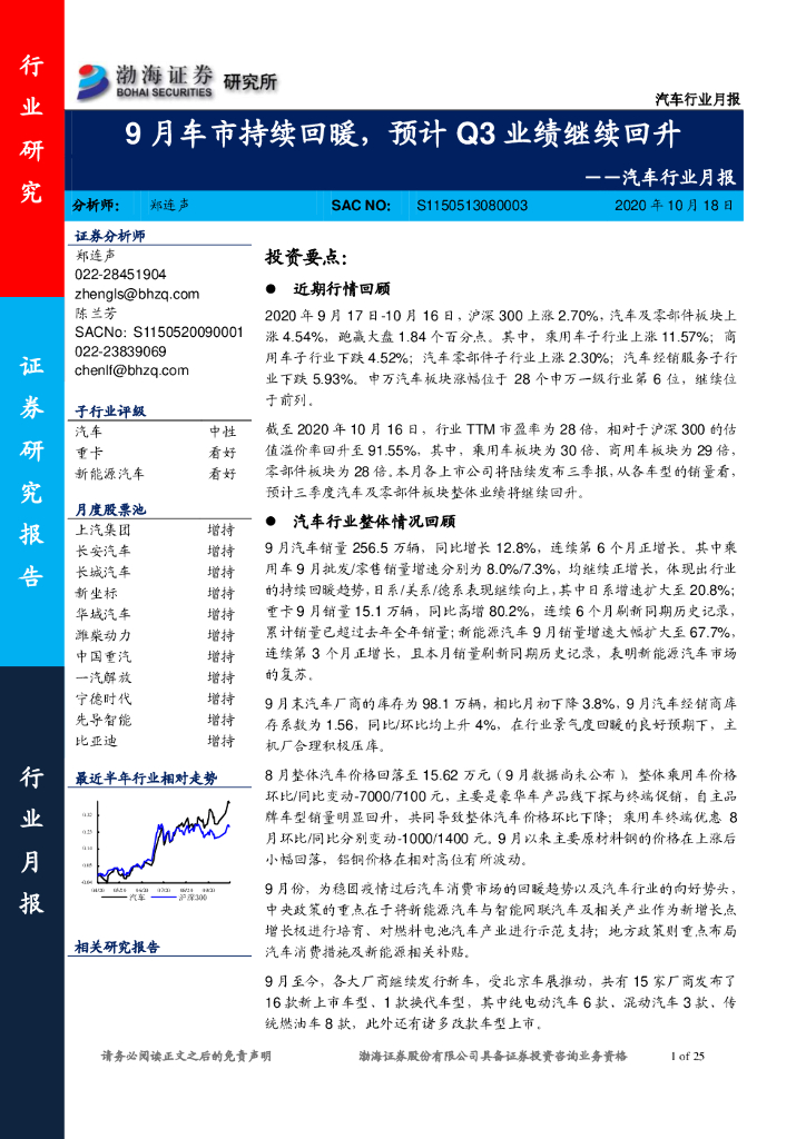 渤海证券:汽车行业月报:9月车市持续回暖,预计Q3业绩继续回升.pdf