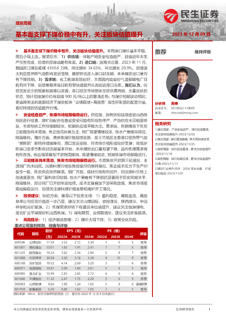 民生证券:煤炭周报:基本面支撑下煤价稳中有升,关注板块估值提升.pdf
