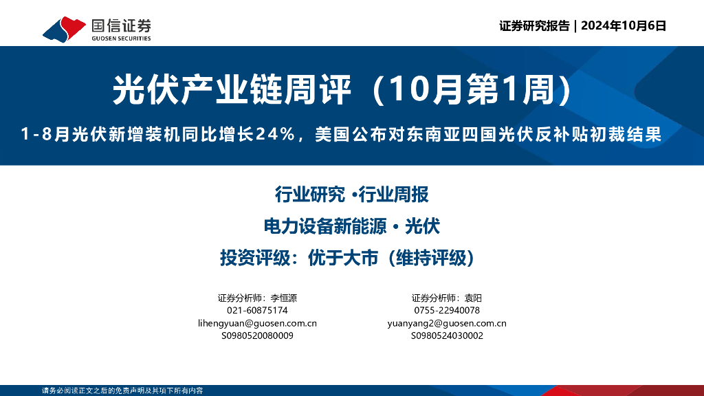 国信证券:光伏产业链周评(10月第1周):1-8月光伏新增装机同比增长24%,美国公布对东南亚四国光伏反补贴初裁结果.pdf