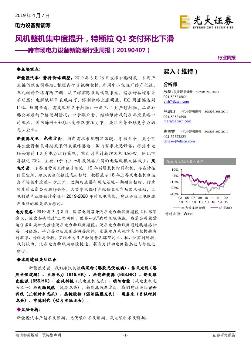 光大证券:跨市场电力设备新能源行业周报:风机整机集中度提升,特斯拉Q1交付环比下滑.pdf