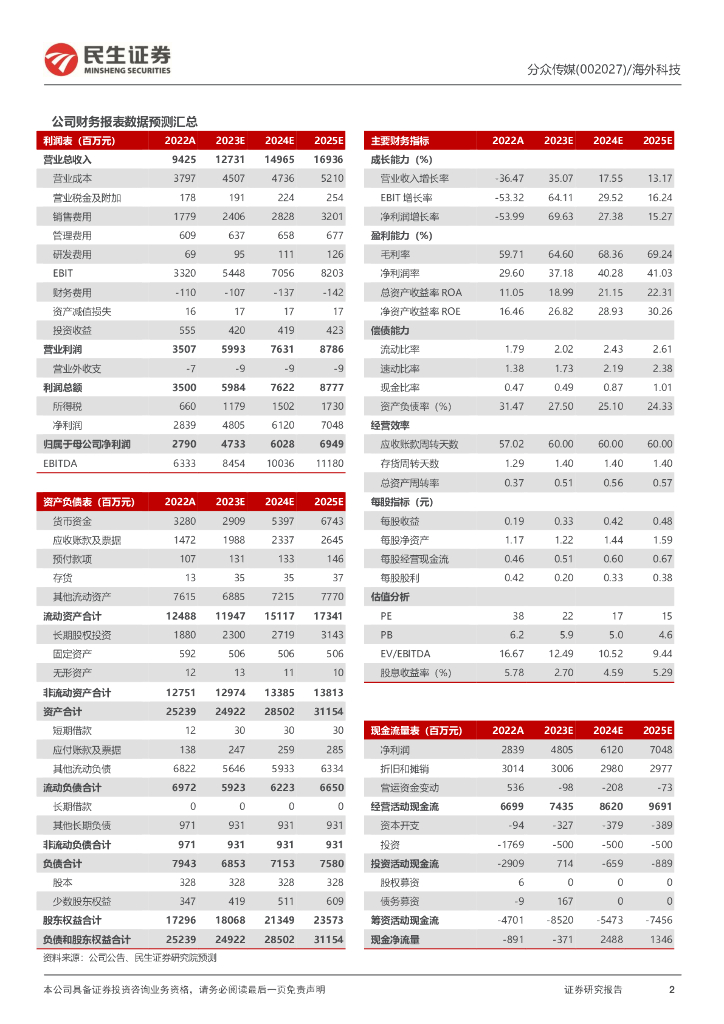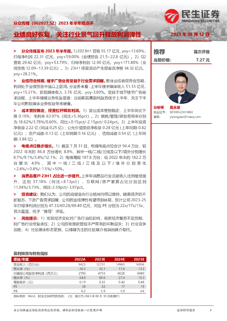 民生证券:分众传媒(002027)-2023年半年报点评:业绩良好恢复,关注行业景气回升释放利润弹性.pdf