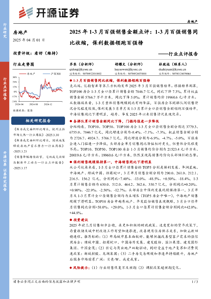 开源证券:房地产2025年1-3月百强销售金额点评:1-3月百强销售同比收缩,保利数据领跑百强榜.pdf