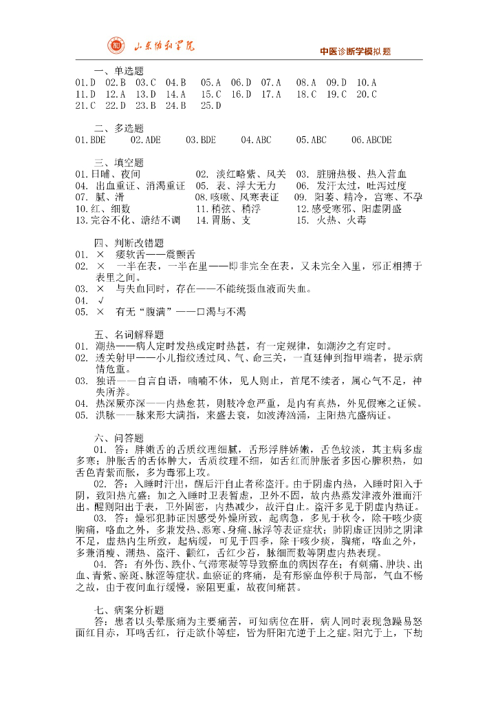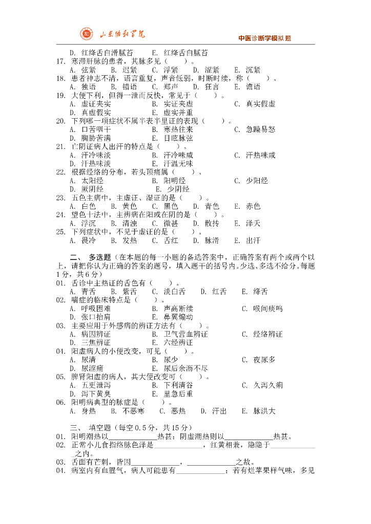 《中医诊断学》测试试卷-《中医诊断学》期末考试模拟题合集.pdf