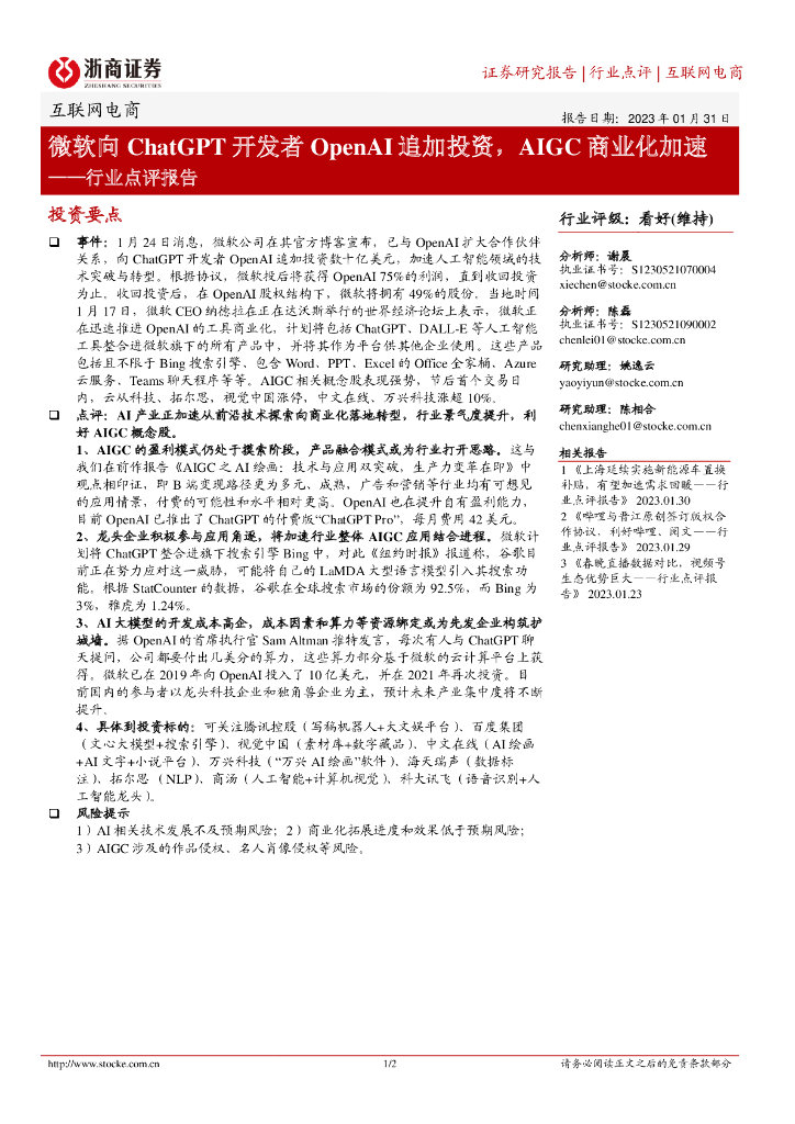 浙商证券:互联网电商行业点评报告:微软向ChatGPT开发者OpenAI追加投资,AIGC商业化加速.pdf