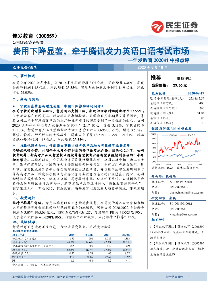 民生证券:佳发教育(300559)-2020H1中报点评:费用下降显著,牵手腾讯发力英语口语考试市场.pdf