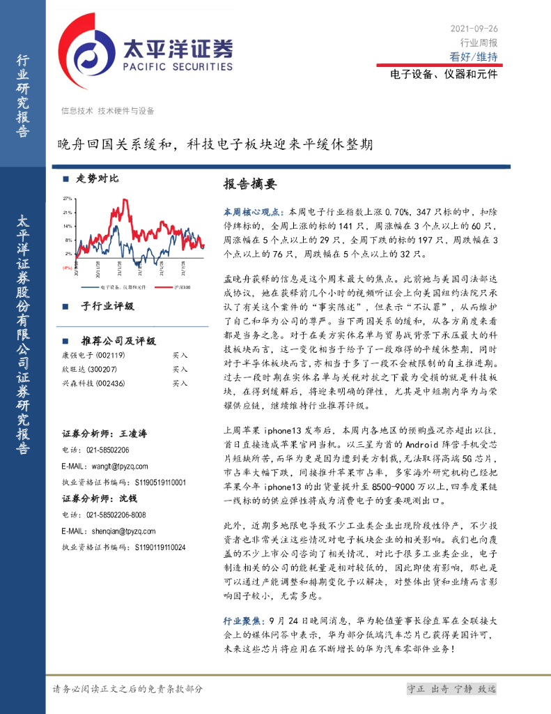 太平洋证券:电子设备、仪器和元件行业周报:晚舟回国关系缓和,科技电子板块迎来平缓休整期.pdf