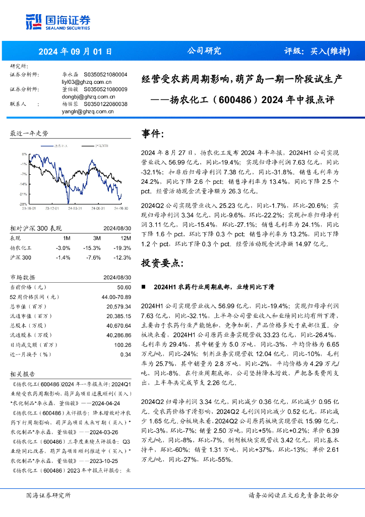 国海证券:扬农化工(600486)-2024年中报点评:经营受农药周期影响,葫芦岛一期一阶段试生产.pdf