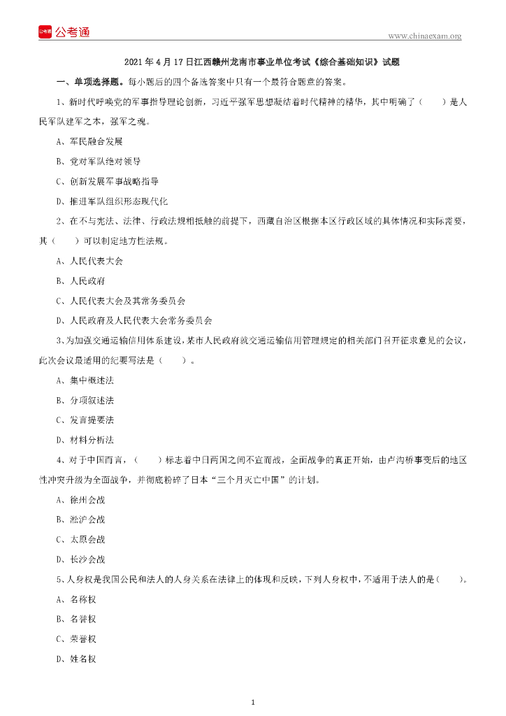 2021年4月17日江西赣州龙南市事业单位考试《综合基础知识》试题.pdf