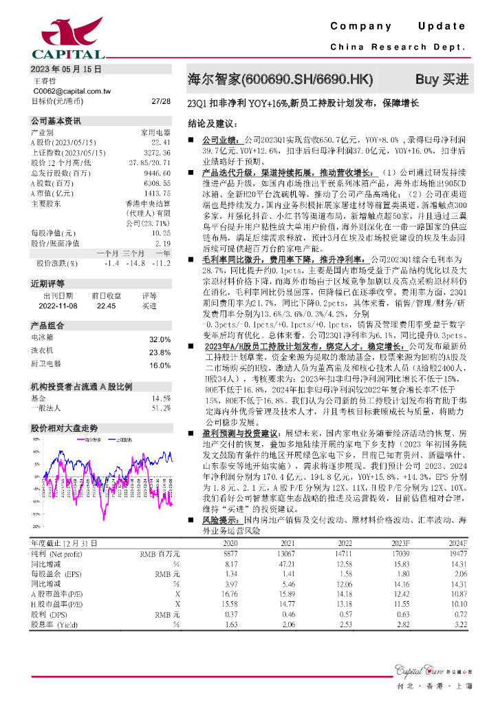 群益证券:海尔智家(600690)-23Q1扣非净利YOY+16%,新员工持股计划发布,保障增长.pdf