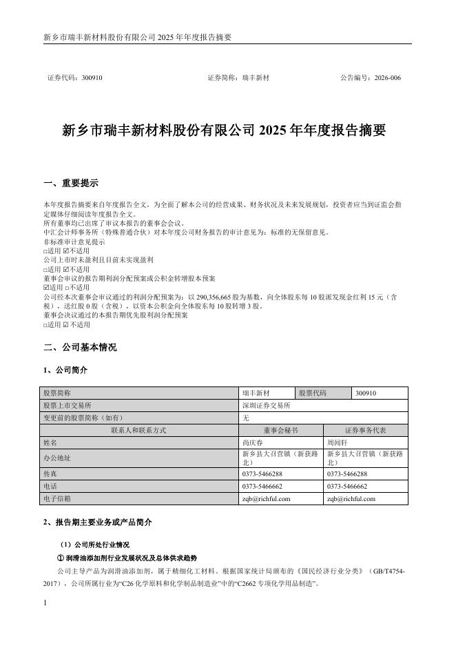 300910-瑞丰新材:2025年年度报告摘要.pdf