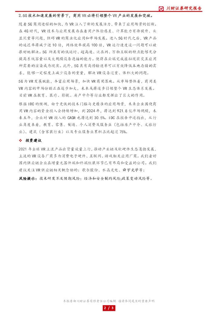 川财证券:高端制造行业事件点评:5G落地加快推动商用VR市场新品百花齐放.pdf