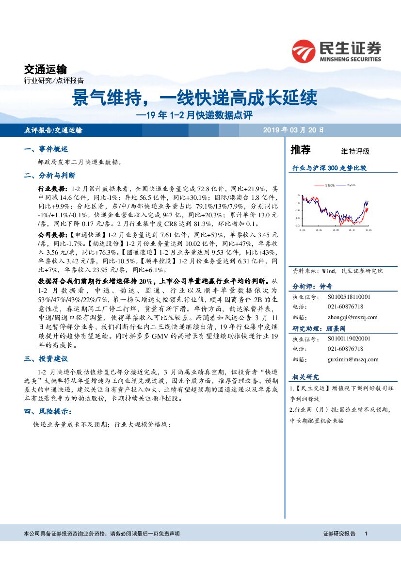民生证券:19年1-2月快递数据点评:景气维持,一线快递高成长延续.pdf
